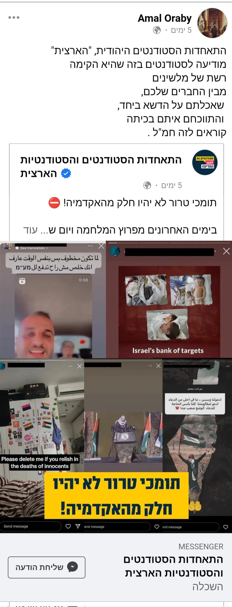 אמל עראבי, עורך דין שעובד בקרן החדשה לישראל, ומקבל במה גם בתוכניתו של גיא זוהר בתאגיד, כעס על כך שהתאחדות הסטודנטים יצאה נגד ערבים תומכי טרור. (על תומכי הטרור הוא לא אמר מילה).