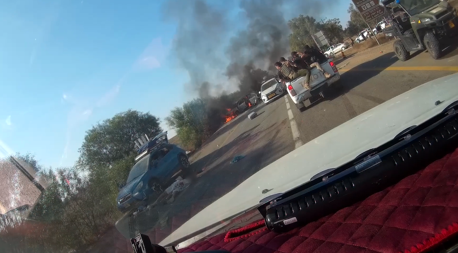 הכביש שורץ במחבלים הנוסעים והולכים לאיטם בין כל המכוניות הנטושות על הכביש. אחת המכוניות בצד עולה באש.